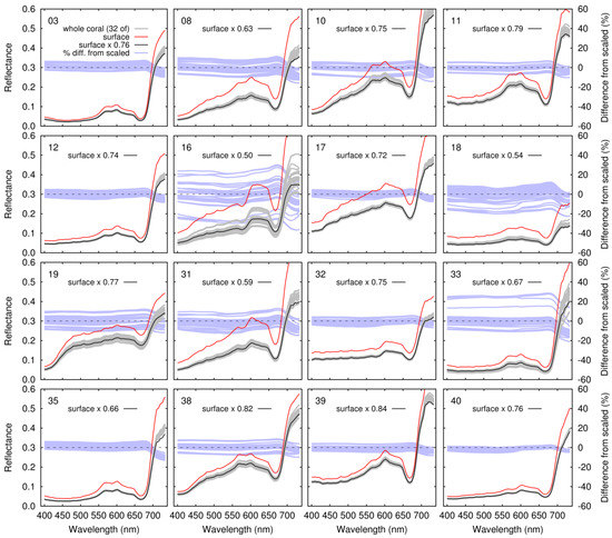 Reflectance over coral shape area only (no substrate) at the bottom of the water column with no interstitial water scattering or attenuation included. Plots show surface reflectance (red), reflectance over coral area under 32 treatments (grey), surface reflectance scaled by shading factor (black), and % difference of each treatment from scaled surface reflectance (light blue, right hand y-axis).