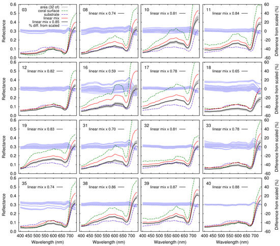 With respect to the modelled reflectance over the coral area (Figure 1g), for all corals, the spectra averaged over the coral area had a very similar shape to the coral surface reflectance but was darker due to shading within the coral structure (Figure 4). The different illumination conditions introduced some variability in the reflectance but in general, this variability was small and certainly smaller than the shading effect. Coral 16 had the highest variability in reflectance under different illuminations, as this coral was a relatively vertical structure with an overall irregular shape when viewed from above; therefore the level of shading was quite dependent on azimuth angle of the incident light. Regarding corals shapes that were flatter (e.g., coral 39), or with numerous protrusions (coral 35), different lighting conditions produced little variation in the average reflectance (Figure 4).The first useful observation from these results was that in general, the average reflectance over the coral shape up to 690 nm can be represented by a scaled version of the surface reflectance, where the scaling factor < 1 effectively introduces shading as a black endmember in a linear mixing model, i.e., the transformation of surface reflectance R(λ) is of the form R’(λ) = R(λ) × f, where 0 ≤ f ≤ 1 and for a flat Lambertian surface f = 1. Shading endmembers have been used in mineral applications [26]. For each coral, a single scaling factor was deduced as the median value of the fit from 400 to 690 nm to each of the 32 treatments (Table 3, Figure 4). These scaling factors varied from 0.50 (coral 16) to 0.84 (coral 39), and for flatter coral shapes, the scaling factor was higher since less shading was introduced. Corals 18 and 31, which were also relatively vertical structures, had scaling factors of 0.59 and 0.54, respectively. Above 690 nm, the fit to the simple shadow model was not as good, as reflectances over the coral area tended to be higher (Figure 4). It is likely the reason for this is the very high coral surface reflectance above 690 nm (Figure 4). A part of the coral surface that is shaded will “see” in its hemispherical field of view other parts of the coral surface. In wavelengths where the coral surface is highly reflective, those surrounding surfaces will reflect light to the point in question, and so the shading effect will be less overall.