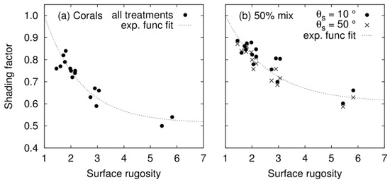 Median shading factor as a function of surface rugosity: (a) Over coral area only (Figure 4), and; (b) over coral area and surrounding substrate in a 50% areal mix (Figure 6) with data separated into solar zenith angles of 10° and 50°. Lines are of the form y = (1 − A) × exp[−S × (x − 1)] + A and are the least squares best fit, giving (a) A = 0.51, S = 0.72; (b) A = 0.61, S = 0.61.