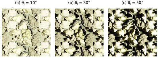 The BRDF function is calculated using light incident only for a specific direction in an otherwise black radiance field (Figure 1i), so in the model outputs, shading effects are very apparent (Figure 8). Visually, Figure 8 may appear to contradict Figure 7b, since shading as a function of incident zenith angle in Figure 8 appears stronger than implied by Figure 7b. To reconcile this first note that Figure 7b is expressed in terms of above-surface solar zenith angles of 10° and 50°, and so most closely corresponds to Figure 8a,b (sub-surface incident angles of 10° and 30°), Figure 8c is a more extreme example. Furthermore, Figure 8 arises from unidirectional illumination, whereas Figure 7b arises from a more diffuse illumination, being the sub-surface propagated solar and sky illumination. A final point is that the increased shadow from Figure 8a to 8b, although visually very apparent, is probably not more than 10% of the actual image area, so even under unidirectional illumination it likely would not affect the shading factor by more than 10%, which is comparable to the differences seen for rugosities ~3 in Figure 7b.