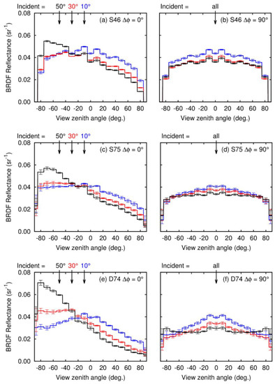 Bidirectional reflectance functions (BRDFs) at 550 nm, of three of the composite coral canopies for shallow (S, 0–10 m) and deep (D, 10–20 m) corals with areal cover: (a,b) 46%; (c,d) 75%; and (e,f) 74%, in the incident plane (a, c, e, Δφ = 0°) and at 90° to the incident plane (b,d,f, Δφ = 90°). Arrows show direction of incident light, each plot shows θi of 10°, 30° and 50°. Negative view zenith angle for Δφ = 0° (a,c,e) means backward reflection (source and view point in the same hemisphere). Error bars are ±1 standard error on 12 values from assumed reciprocity, rotational and mirror symmetries.