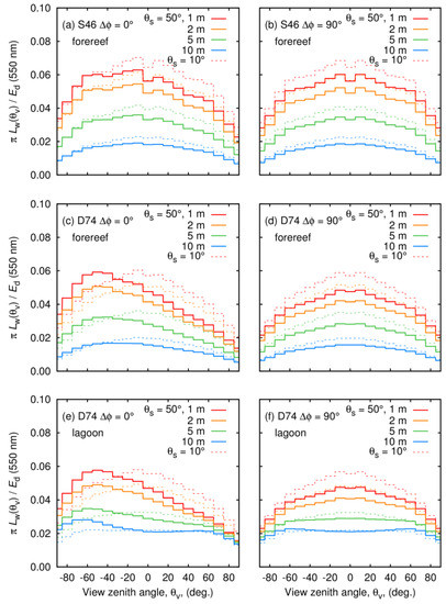 Modelled influence of three-dimensional coral BRDF effects (from Figure 9) on water-leaving reflectance (π Lw/Ed) at 550 nm for: (a,b) Composite canopies S46 (46% shallow coral cover) and; (c,d,e,f) D74 (74% deep coral cover), in the incident plane (a,c,e, Δφ = 0°) and at 90° to the incident plane (b,d,f, Δφ = 90°). Each plot shows results of incident solar zenith angles of 10° (dotted lines) and 50° (solid lines), and depths 1, 2, 5, and 10 m. Negative view zenith angle for Δφ = 0° (a,c,e) means backward reflection (source and view point in the same hemisphere).