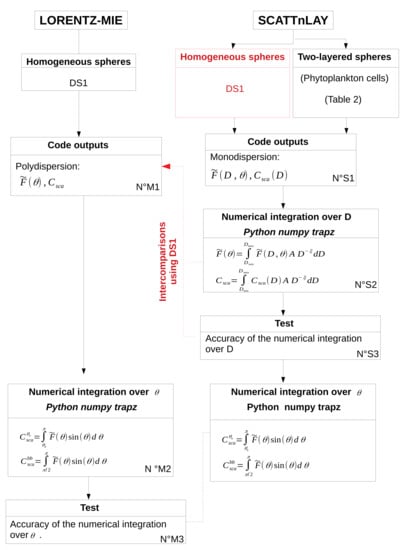 The Meerhoff Mie program version 3.0 [] and the ScattnLay code [,] are used to simulate the scattering and absorbing properties of homogeneous and multilayered spheres, respectively. Radiative transfer computations are carried out given the wavelength of the incident radiation equal to 532 nm and the refractive index of sea water equal to 1.34. The Meerhoff Mie program allows simulations of a polydisperse ensemble of spheres with a large choice of PSD. The outputs are the ensemble-average quantities per particle , and (Equations (2) and (3)). The ScattnLay code performs computations only for monodisperse particles. To obtain the normalized phase function and cross sections for a polydisperse population, a numerical integration over the size range must be done separately (Figure 1, NoS2). Particular attention must be paid to the integration step to guarantee the accuracy of the numerical integration.