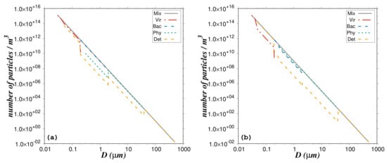 Composite PSD as derived from individual PSDs of the five considered particle groups for (a) the oligotrophic-like water body and (b) the phytoplankton bloom water body. N = 1.1262 × 10 particles per m and = 4.