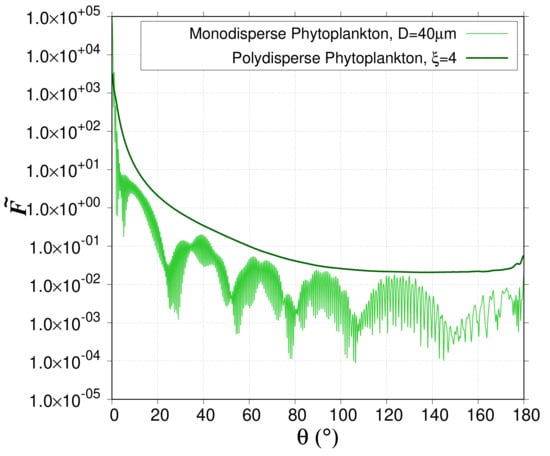 In situ laser diffraction measurements of the PSD in different oceanic regions showed that the size distribution of marine particles can be approximated by the Junge-like power law [,,]. As discussed by Reynolds et al. [], the power law with a single slope is a convenient empirical descriptor of the PSD, but we have to keep in mind that, in some cases (e.g., in nearshore waters and in the presence of specific populations of phytoplankton) the particle size distribution deviates from the Junge-like power law [,,]. Relatively steep hyperbolic slopes (around 4) are encountered in open ocean waters, whereas less steep slopes (around 3.3) are characteristic of phytoplankton bloom and/or production of particle aggregates. In the present study, results are discussed for = 3, 3.5, and 4 as the vast majority of hyperbolic slopes are in this range (Figure 11 in [,]). Results are shown also for = 2.5 and 5 but hyperbolic slopes greater than 4 are much less likely to occur. Likewise, < 3 are rare excepted when there is biological growth in the relatively large size classes and/or aggregation. To compare with typical particulate abundances estimated in natural waters, a total abundance (N) of 1.1262 ×10 particles per m is considered to be in Stramski et al. []. Three case studies are defined. The first one represents oligotrophic-like waters with no phytoplankton bloom and no-mineral particles: the phytoplankton abundance (N) spans from 1.1 × 10 (for = 4.9) to 4.6 × 10 (for = 2.5) particles per m (0.001%–0.41% of N). The second one represents waters with a phytoplankton bloom and no minerals, where N is higher as compared to the oligotrophic-like case: N ranges between 8.3 × 10 (for = 4.9) and 2.3 × 10 (for = 2.5) particles per m (0.007%–2% of N). The third one represents coastal-like waters with minerals and no bloom conditions: minerals are added proportionally to obtain a bulk real refractive index around 1.1. The mineral abundance (N) spans from 4.8 × 10 (for = 4.9) to 1.3 × 10 (for = 2.5) particles per m (4.2%–11.7% of N).