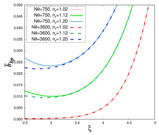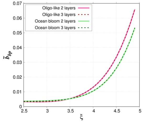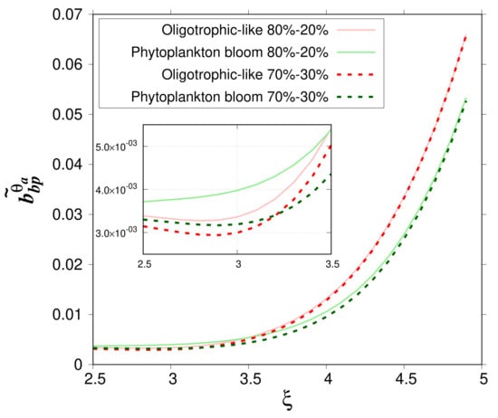 Regardless of the morphological model used to optically simulate phytoplankton cells, the reaches an asymptote when decreases for phytoplankton bloom water bodies ( = 0.005 for = 3.5 and 0.004 for = 2.5). The value of the asymptote is consistent with previous observations [], which showed the lowest backscattering ratio (about 0.005) in waters with high chlorophyll-a concentration.