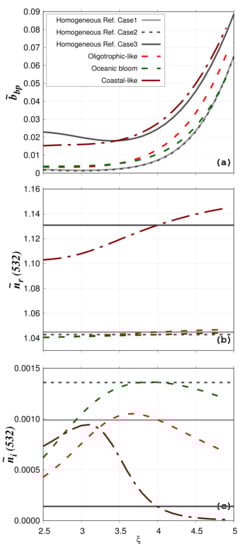 Even if the numerical relative abundance of phytoplankton is very small for the oligotrophic-like water body (=8.4 × 10%), the structural heterogeneity increases the value by 58% compared to the homogeneous case (“Homogeneous reference case 1”). This is consistent with previous studies showing the large contribution of coated spheres to the backscattering signal [,,,,,]. The value of calculated between the oligotrophic-like and phytoplankton bloom water bodies is smaller (=22% at = 4) even if is different (9.93 × 10 for oligotrophic-like against 1.36 × 10 for phytoplankton bloom). This latter pattern provides evidence that the structural heterogeneity (coated-sphere model) has a greater impact on the particulate backscattering ratio than the tested increase in the bulk imaginary refractive index. The relative absolute differences between the phytoplankton bloom and “Homogeneous reference case 2” is 41%. When mineral particles are taken into account, is 12% between the “Homogeneous reference case 3” and the coastal-like water body. This smaller difference is because phytoplankton have a smaller impact on the bulk scattering when highly scattering particles such as minerals are added.