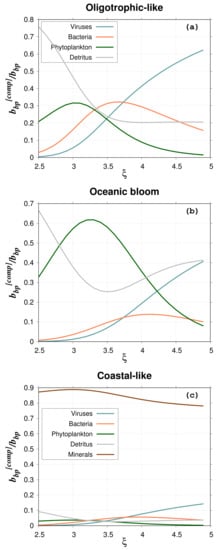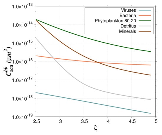 The contribution of the different particle groups to the backscattering ratio is presented in Figure 8 for the 80%–20% model and = 4. For coastal-like waters, the minerals contribute more than 80% of the total , whereas they contribute only 6.5% to the total particulate abundance. This percentage agrees with the results of Stramski et al. [] (Figure 12 in their paper). Such high contribution to backscattering is due to the high real refractive index of minerals. As in Stramski et al. [], these results show the important role of minerals even when they are less abundant than organic living and non-living particles. In oligotrophic-like waters, the contribution of heterotrophic bacteria ranges from a few to about 30% with a maximum for between 3.5 and 4, which agrees with Stramski and Kiefer []. The contribution of viruses is quite high, about 40–60% for between 4 and 5. This high contribution is explained by the extreme value of viral abundance (around 1 × 10 particles per cubic meter) used in this study []. As for bacteria, the contribution of phytoplankton ranges between a few and 30% with a maximum around = 3. For a value of 4, typical of oligotrophic waters, the contribution is around 10%. For the phytoplankton bloom study case, the contribution of phytoplankton cells is between 10% and 60%; maximum values are reached for a PSD slope between 3 and 3.5. Such high percentages are due to the higher backscattering cross section of phytoplankton as compared to the other particles (Figure 9). The low phytoplankton abundance is offset by the high so that the backscattering coefficient of phytoplankton represents a significant contribution to the total backscattering.