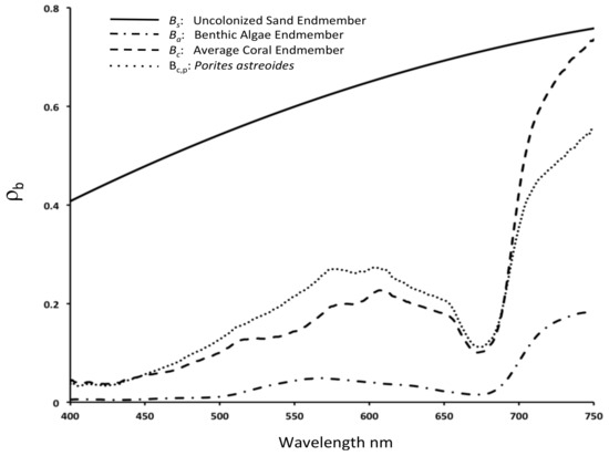 Equation (10) does not offer an absolute measure of spectral discrimination. For example, wavelengths in the red and near-IR portions of the spectrum are absorbed at higher rates than those in the mid- and short-range portions of the visible spectrum, due to absorption by pure water. Hochberg et al. [13] noted this effect and suggested that remote sensing approaches to coral reef environments are best achieved at wavelengths shorter than 580 nm. Likewise, coral reefs ecosystems are often sources of colored dissolved organic matter [42] that increases water absorption in the blue portion of the spectrum. As ε approaches the threshold value, will generally be greater than the threshold in some portions of the spectrum, likely in the mid-visible range where light transmission is a maximum, and less than the threshold in the blue and red regions of the spectrum.