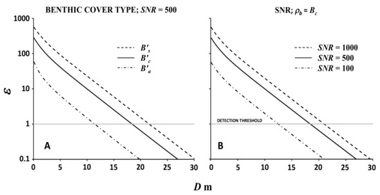 It is shown that SNR can impose significant limitations on the ability to detect benthic cover, bottom depth, and water constituents for all but the shallowest reef conditions considered (D = 1 m). The threshold criteria for signal detection, ε = 1, essentially quantifies the average difference between a reference condition and many test conditions relative to sensor noise imposed on the two signals. If ε > (≤) 1, then the two signals are (are not) detectable as two distinct conditions. Since ε expresses the spectrally averaged difference, one should expect that ε > 1 in some parts of the spectrum while in other parts ε < 1. The criteria might, therefore, be viewed as too constraining since there will likely be unique information remaining where ε > 1. However, the amount of retrievable information will diminish as portions of the spectrum become progressively immersed within the envelope of sensor noise. Thus, ε may be viewed as a reasonable proxy for the difference between two similar spectra.