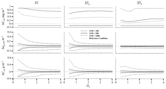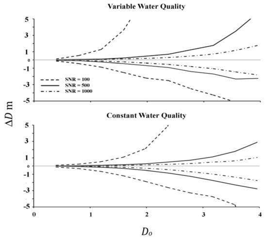 Uncertainty in the detection of bottom depth increased with increasing reference depth, expressed as the dimensionless optical depth Do (= and sensor noise, expressed as the difference between the upper and lower bounds of spectral similarity and the reference condition, ΔD (Figure 4). Positive values indicate an overestimation of D′ and negative values indicate underestimation. The rate of increase in uncertainty with respect to the reference bottom depth was greatest for SNR = 100 and progressively diminished for SNR = 500 and 1000. Retrieval uncertainty was greatest when no assumptions were made about the environment, i.e., scenario S1, where water constituent concentration was allowed to vary across the prescribed ranges. However, when water constituent concentration was constant and set equal to the reference condition (S2), uncertainty in bottom depth retrieval decreased for each of the SNR values (bottom panel in Figure 4), although uncertainty associated with SNR = 100 remained noticeably greater than for SNR = 500 and 1000.