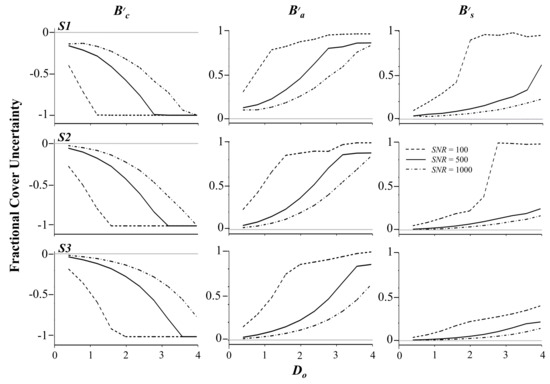 Constraining water constituent concentration to the reference condition (S2) resulted in a decrease in uncertainty in benthic cover detection regardless of SNR. For example, when Do = 1.1, underestimation of decreased from the S1 values to −0.78 for SNR = 100, −0.18 for SNR = 500, and −0.09 for SNR = 1000. Detection uncertainty between coral and benthic algae and between vegetated and uncolonized substrates decreased similarly. Incorporating knowledge of bottom depth (S3) decreased uncertainty further; for Do = 1.1, the underestimation of decreased to −0.58, −0.12, and −0.06 for SNR = 100, 500, and 1000, respectively.