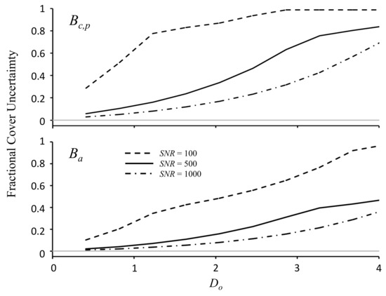Uncertainty in the retrieval of endmember benthic cover increased with sensor noise (decreasing SNR) and the reference bottom depth (Figure 5). As the bottom depth increased, the lower confidence bound for decreased from the reference condition of 100% coral cover while and increased from the reference condition of 0% cover. Allowing water constituent concentrations and bottom depth to vary across the allowable range (S1), coral and benthic algae were indistinguishable for SNR = 100 and Do > 1.1; −1 ≤ ΔBc ≤ 0 and 0.79 ≥ ΔBa ≥ 0, where Δ indicates the difference between the upper and lower bounds of the test conditions and the reference condition. Negative values indicate under estimation of reference benthic cover while positive values indicate overestimation. Increasing SNR to 500 decreased the underestimation of to −0.28 and the overestimation of to 0.23. This trend continued as SNR increased to 1000, but the rate of change as a function of SNR was considerably less. Uncertainty in distinguishing between (or ) and was generally lower, due to a greater contrast between the vegetated and uncolonized substrates. The increase in uncertainty in benthic cover with increasing bottom depth is well understood and reported. The impact of SNR on benthic cover uncertainty was also reported by Hedley et al. [26] and expressed as the statistical overlap between specific conditions with noise applied, but their analysis did not suggest a large impact of SNR compared with environmental noise.