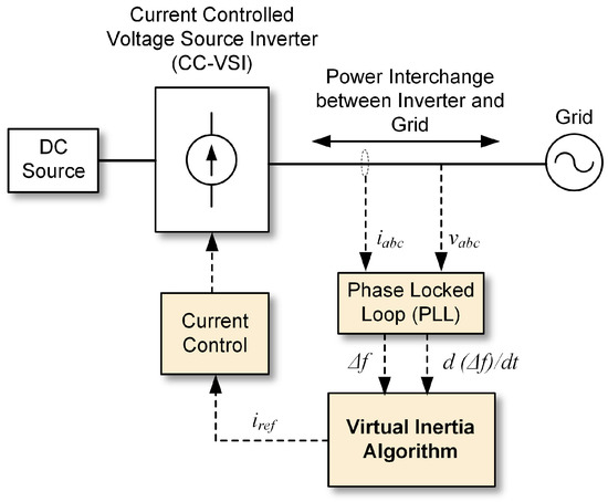 Virtual inertia emulation through appropriate control of power electronic converters has been widely proposed as a possible solution to counteract these issues. Virtual inertia is a combination of control algorithms, energy storage systems (ESS), and power electronics that emulates the inertia of a conventional power system [4]. Inertia can be emulated through use of ESS or by operating the RES units below their maximum power points, providing a reserve for the inertial response [5]. A number of algorithms has been proposed for this in the literature under different names such as virtual synchronous machines [6], virtual synchronous generators [7], synchronverters [8], and synchronous power controllers [9]. In most cases, a “current feedback loop” is employed to inject/absorb the inertial power through these systems. Because this power comes in short bursts based on frequency changes, a well-designed “current feedback loop” with good transient response and low steady-state error is required for a functional implementation.