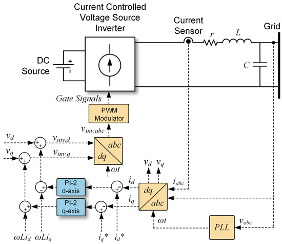 Figure 2 shows the control structure of a PI Type-2-based current control of the grid-connected inverter along with the benchmark that will be used throughout this paper. The PI Type-2 controller is a variation of the traditional PI controller with an extra pole at the high frequency range to compensate for the high frequency switching noises. A PLL is used to track the phase of the grid voltage [20,21]. The three-phase inverter output current is continuously measured using current sensors and first transformed into the domain using the Park transformation (). The cross-coupling terms ( and ), which are usually neglected during the design of the PI controller, can also be compensated in the control structure, which improves the dynamics of the controller [20]. Moreover, the grid voltage is also transformed into the domain and fed forward, which helps in stabilizing the output voltage of the inverter faster and also aids in the synchronization process [22]. The output of the PI controllers is then transformed back into the domain using the inverse Park transformation () and used as modulating signals for the pulse width modulation (PWM) modulator. The transfer function of the plant (i.e., a grid-connected inverter with an LC filter) for the design of the PI controller can be modeled as [22]: