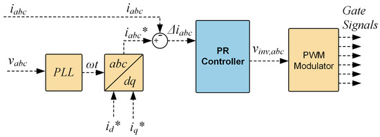 Schematic diagram of a PR-based current controller; PR: proportional-resonant; PWM: pulse width modulation; “*” represents the reference values of the signals.