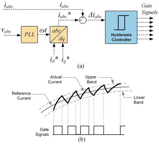 Figure 4a shows the control structure for a hysteresis current controller. The reference current in the domain is transformed into the domain. The reference current, , is then compared with the feedback current , and the error is fed into the hysteresis band to generate the switching signals for the three-phase inverter. Figure 4b gives a more detailed description of the gate signals’ generation processes. When the actual current output of the inverter exceeds the pre-defined hysteresis band, the gate signal goes low, causing the current to decay. The rate of decay depends on the time-constant of circuit (r and L parameter values). As the current decays, the current exceeds the lower hysteresis band, and the gate signal goes high, causing the current to rise. In this manner, the actual current waveform is made to follow the reference current within the pre-defined hysteresis band. The hysteresis band selection is often selected to be between 2 and 5% of the reference current [33]. The band is usually limited by the switching capability of the switches and the electromagnetic interference concerns. The lower the band, the higher the switching frequency, and vice versa.