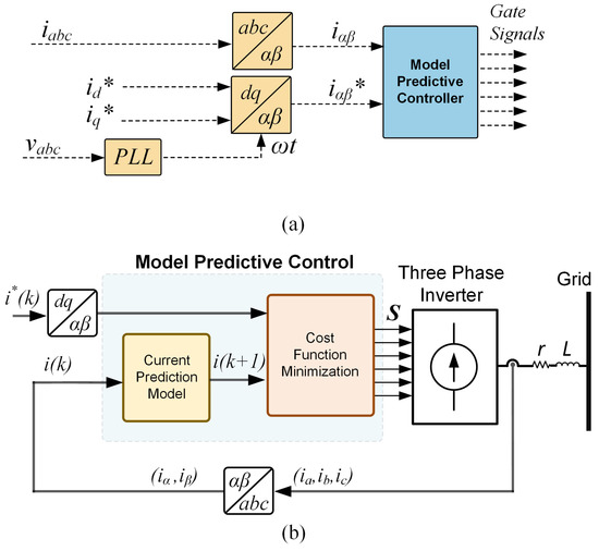 Figure 5a shows the control structure for current control using MPC. The reference current in the domain is transformed into the domain. Similarly, the feedback current, , is also transformed into the domain. The MPC controller then uses these signals to generate the gate signals. Figure 5b shows the details of the MPC block. The feedback current is used along with a current prediction model given by Equations (5) and (6) to predict the currents in the next sampling instant [37].
