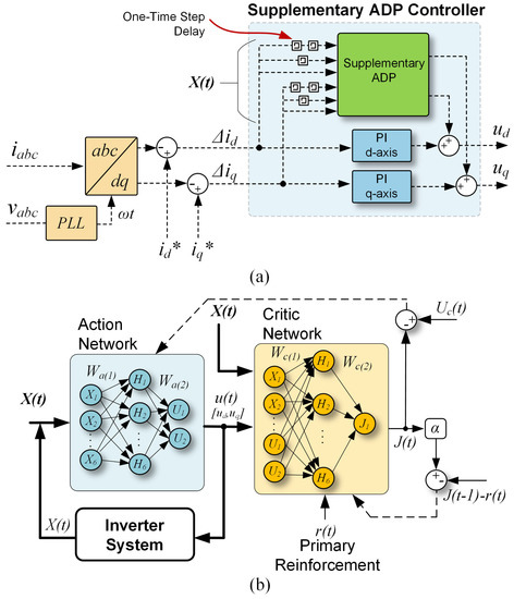 The integration of the supplementary ADP controller with the PI controller presented in Figure 2 is shown in Figure 6a. In a model-free ADP-based controller design, the exact mathematical model is not a prerequisite. The controller observes the input error vector, , from the system and provides the control signal, , for the PWM modulator. These control signals are applied on the modulating signals to adjust the PWM gating signal. The details of ADP controller are shown in Figure 6b. A reward signal (or the primary reinforcement signal), , is provided based on the current system performance. The optimal cost function, J, which is also the output of critic network, is used to critique the performance of the control signal.