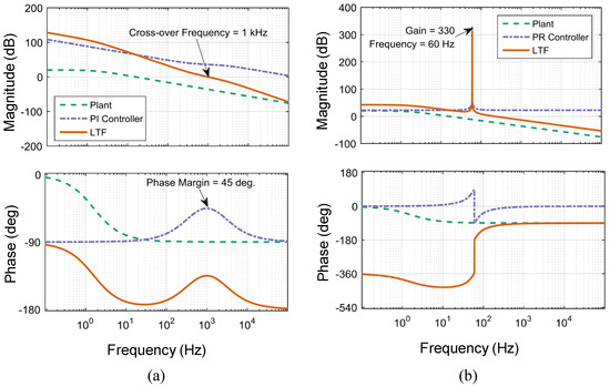 For the design of the PR controller, it is important to ensure that the controller can show zero steady-state error to signals at the resonant frequency, which in this case would be the grid frequency of 60 Hz. As such, the parameter in this design was taken to be 376.9 rad/s (60 Hz), and the ratio of the parameters, , was taken to be 300, which ensures that the resonant constant, , has a sufficiently high value. A high value of around the resonant frequency ensures the controller can exhibit near to zero steady-state error and track the 60-Hz sinusoidal signal accurately [22]. The constant was then calculated such that the resulting loop transfer function had a damping ratio of 0.42, which corresponds to a phase margin of 45, as in the case of the PI controller designed previously. The calculated value of was 13.20. Figure 7 shows the frequency response of the plant, the designed PR controller, and the loop transfer function of the overall system. It can be observed that the controller has a high gain around the grid frequency of 60 Hz, as desired. Using these calculated values in (4), the transfer function of the designed PR controller was: