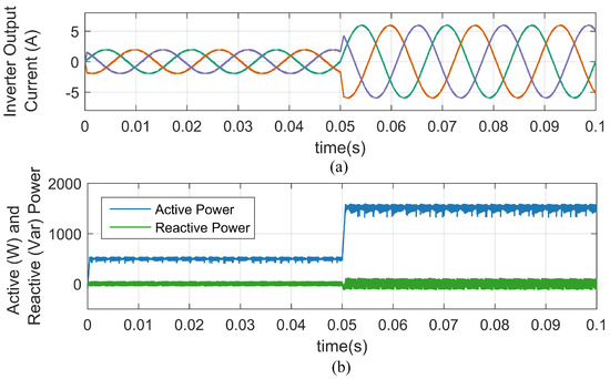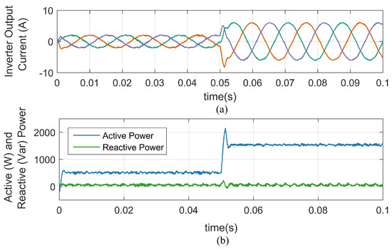 The output current of the grid-connected inverter when a MPC was used in the current control loop is shown in Figure 11a. As with the case of PR and hysteresis control, during the step change in the reference current, there were no distortions. Figure 11b shows the change in the active power of the grid-connected inverter corresponding to the change in the output current. The response speed of the output power was the fastest among PI, PR, and hysteresis control, which was suitable for virtual inertia emulation, as discussed previously. The frequency of a weak grid with lower inertia can decrease/increase quickly, and the additional required inertia has to be emulated almost instantaneously to prevent significant changes in frequency [51]. The fast response of the MPC technique can be exploited for this effect. However, the absence of a modulator and the variable switching operation means both the active and reactive power have a higher output ripple. Moreover, the high switching frequencies generated may lead to increased system losses.