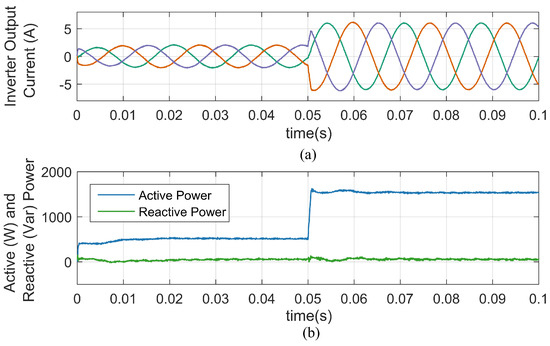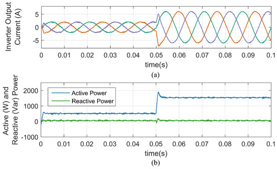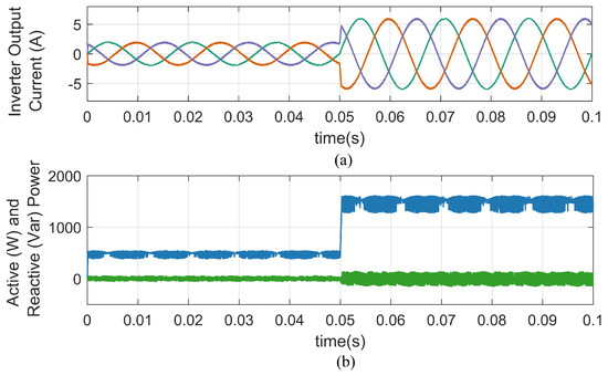 The output current of the grid-connected inverter when a PI controller was used in the current control loop is shown in Figure 8a. During the change in the reference current command at 0.05 s, the shape of the current waveform was slightly distorted during the transient, but quickly recovered to maintain a sinusoidal shape. The change in d-axis current means that the output power of the inverter changed from 500–1500 W, as shown in Figure 8b. There was an overshoot of 40% in the active power response, which was slightly higher than expected for a PI controller designed with a phase margin of 45°. This can be attributed to the peaks from the switching of the converter. Such an overshoot can be critical for larger systems, as the inverters need to be over-sized, which ultimately increases the cost. The overshoots can theoretically be minimized in the control design phase, but would result in a slower speed response. The reactive power, however, remained constant at around 50 Var (average) throughout the simulation as the q-axis reference was kept at 0 A. There was a short transient pickup in the reactive power when the active power changed.