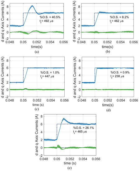 Comparison of d-axis and q-axis current responses. (a) PI controller. (b) PR controller. (c) Hysteresis controller. (d) MPC. (e) Supplementary ADP controller; O.S.: Overshoot.