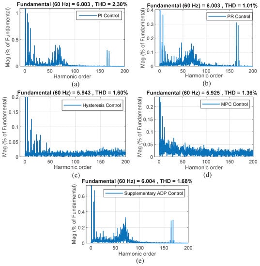 Comparison of the harmonic spectrum of the output current. (a) PI controller. (b) PR controller. (c) Hysteresis controller. (d) MPC. (e) Supplementary ADP controller. THD: Total Harmonic Distortion.