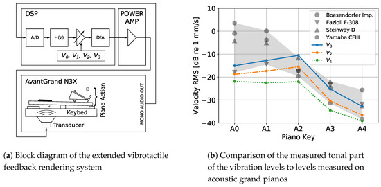 (a) Block diagram of the vibrotactile feedback rendering system to generate the key vibrations; the mono audio output of the N3X was filtered and attenuated with a DSP. Thereafter the signal was power amplified to drive the transducer of the built-in vibrotactile rendering system of the N3X. (b) Comparison of the tonal part of the vibration levels to vibration levels of four acoustic concert grand pianos. The comparison is based on vibrometer measurements of forte keystrokes [7]. ( is not shown because it corresponds to no vibrations.)