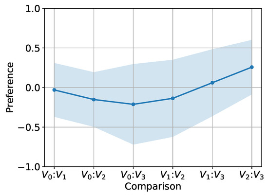 Analysis of the preference ratings (“better” (1), “worse” (−1), or “similar” (0)) of the vibration levels across all parts and all participants. The ratings are based on direct comparisons between all pairs of levels. The ratings are relative. For example, a positive value for : indicates a preference of over and a negative value a preference of over . The shaded area marks the standard deviation of the ratings.