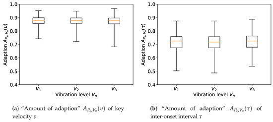 Figure 3 shows the “amount of adaption” of the pianist’s playing to the feedback levels for both performance parameters. The differences in Figure 3 are not significant. There is no general tendency that the participants adapt their playing to the key vibration level. Nonetheless, by analyzing the influence of the vibration levels per participant individually, three participants showed significant differences for key velocity and three for inter-onset interval .