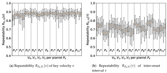 The resulting repeatability per vibration level and per participant is presented in Figure 4 for key velocity and inter-onset interval . The differences in repeatability were significant for a majority of the participants. However, no consistent tendency or pattern in repeatability occurred among the pianists in Figure 4.