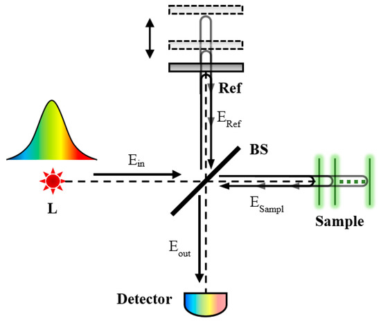 Figure 1 shows a schematic diagram of a typical TD-OCT system. Here the optical beam from a broadband light source is split into a reference and sample arm, respectively, using a beam-splitter, which also recombines the respective back-reflected beams into a photodetector, such as a photodiode, for heterodyne detection [12,13,14]. By systematically displacing a reference mirror by means of a motorized stage, scanning along the depth/axial direction of the sample can be achieved. A single depth scan is performed by measuring the interference signals as a function of time while the reference arm is moved. Thus, such a measurement requires time and the mechanical movement of a mirror to acquire axial information of the sample.