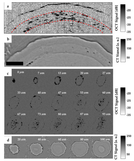 B-scan and en face images captured with full-field optical coherence tomography (FF-OCT) for characterising the micro-structure of a double-layer coated pellet. The FF-OCT B-scan in (a) and the en face results in (b) are validated by XμCT in (b,d) on the same pellet sample. Two dashed red lines in (a) indicate the upper and lower interfaces of the inner coating layer. Adapted from [35].