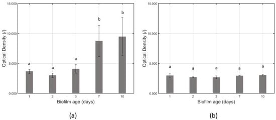 Total biofilm mass, expressed as optical density (-), for the untreated (a) L. monocytogenes and (b) S. Typhimurium biofilms following 1, 2, 3, 7, and 10 day(s) of incubation. For each species, bars bearing different lowercase letters are significantly different (p ≤ 0.05).
