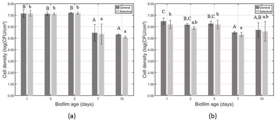 Cell density (log(CFU/cm2)) determined on general and selective medium for the untreated (a) L. monocytogenes and (b) S. Typhimurium biofilms following 1, 2, 3, 7, and 10 day(s) of incubation. Bars bearing different letters (no capital or small letters in common for the general and the selective medium, respectively) are significantly different (p ≤ 0.05).