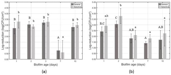 Based on the results that are presented in Figure 4a, it can be concluded that significantly lower log-reductions are obtained for the seven days old L. monocytogenes biofilms, and this for both the general and the selective medium. This means that the CAP inactivation efficacy is significantly lower for the seven days old biofilms or, in other words, that the L. monocytogenes biofilm-associated cells become more resistant towards CAP inactivation as the biofilm ages. For the 10 days old biofilms, however, the log-reductions are again similar to those obtained for the 1, 2, and 3 day(s) biofilms, meaning that the resistance towards CAP treatment decreases again.