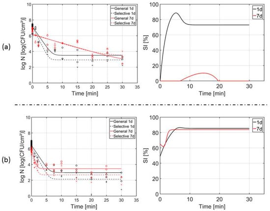 First of all, differences can be observed between the initial cell density (N0) of the one and seven day(s) old biofilms, i.e., the cell density decreases as the biofilm ages, although not significantly. This is in contradiction with the results that were obtained in Section 3.1, however, this might be the result of experimental/biological variability or due to the model fit. When the percentages of sub-lethally injured cells prior to treatment are compared, it can be observed that this percentage slightly increases with an increased biofilm age, which might be the result of nutrient limitations and/or waste accumulation [38]. Nevertheless, this small difference could also be the result of experimental variability.