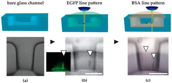 Multi-protein line pattern of enhanced green fluorescent protein (EGFP) and consecutive BSA inside a glass microchannel with a 200-kHz laser. Schematic drawing and top view bright field microscopy image. Black arrows indicate work-flow, white arrows highlight pattern. (a) A bare glass microchannel. (b) As a first step, the channel was filled with EGFP solution and a line was polymerized near the inlet with 6.4 mW and 2 μm/s. The dashed area was imaged by a fluorescence microscopic unit with an excitation of 450–480 nm and emission of 520–800 nm. The inset fluorescence image confirmed the EGFP line to be fluorescent. (c) In continuation, the sample was filled with BSA solution and a second line pattern was polymerized with 6.4 mW and 200 nm/s. Scale bars represent 100 μm.