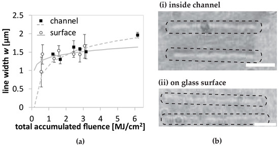 We evaluated structures and line patterns made on top of the channel surface as well as inside the channel at the ceiling. As a feature size, line width is measured from in situ images and fit against the product of the total accumulated fluence (TAF) and fluence, calculated from laser power, scanning velocity, and laser parameters. The function for fitting reflects a two-photon absorption that induces the radical generation. The dependency of the product of TAF and fluence is determined in the supplementary information using Equations (1)–(14), where the effective number of pulses [23] and line width dependence of laser power and processing time [24] are considered. The fitting results are shown in Figure S1. Since a product of TAF and fluence is not intuitive and only utilized to satisfy the equation, the fitting parameters are applied together with fluence to depict the dependency of TAF in the results.