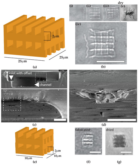 Figure 5a illustrates a 6-μm-high, four-layer woodpile design that has been employed for fabrication inside a microchannel as shown by the in situ time-lapse snapshots in Figure 5b. SEM observation after freeze-drying, metal coating, and glass cutting verified the formation of the structure at the channel ceiling (Figure 5c,d). The line pattern of one layer can be identified at all sides of the structure. Lines in the center are difficult to identify individually because the created structure collapsed and stacked together during the drying process. Figure 5e–g illustrates how a more compact woodpile design allowed for less collapse after drying. During cutting, the channel ceiling with the structure attached broke apart. The conservation step of drying proteinaceous microstructures is already challenging for fabrication on top of the cover glass due to the attachment and low mechanical strength; moreover, drying inside the microchannel requires refined handling. Opening the microchannel for SEM observation is also difficult, because the structures need to be close to the cross-sectional cut without breaking apart.