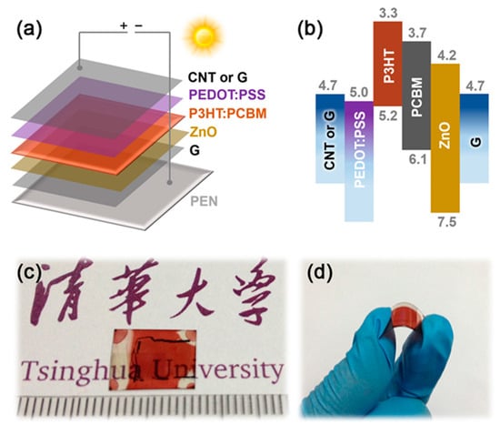 First of all, to evaluate the feasibility of carbon-based film materials as all-carbon electrodes, CVD graphene and CNT films were used to fabricate OPV cells. The mixture of C60-based derivative (phenyl-C61-butyricacid methyl ester: PCBM) and P3HT (poly(3-hexyl)thiophene) [39] was employed as an active layer to absorb incident radiation and generate excitons. The schematic diagram of our devices is shown in Figure 1a. Graphene films were firstly transferred onto a flexible PEN wafer as bottom electrodes, and then ZnO nanoparticles were spin-coated as an electron transport layer [51]. In order to gain homogeneously dispersed nanoparticles, this step was repeated twice. After the active layer and hole transport layer of poly(3,4-ethylenedioxythiophene):poly(styrenesulfonate) (PEDOT:PSS) were coated, CNT or G films were laminated as the top transparent electrode. In the energy band diagram shown Figure 1b, the work functions of CNT and graphene films are set to 4.7 eV, depending on their thickness and purity [36,52]. On the top side, i.e., the anodes, the energy band of CNT and graphene films is near to that of ITO, which is slightly lower than the highest occupied molecular orbital (HOMO) of PEDOT:PSS. This match is favorable to extract and collect holes to the external circuit. The whole energy band diagram theoretically indicates that it is viable to use all-carbon electrodes in this structure. Semitransparent and flexible solar cells with all-carbon electrodes are shown in Figure 1c,d. It is indispensable to use transparent and flexible PV devices in some applications, such as power-generating windows and portable electronic devices. So, there are structural advantages to using two-dimensional carbon nanomaterials as electrodes in solar cells.