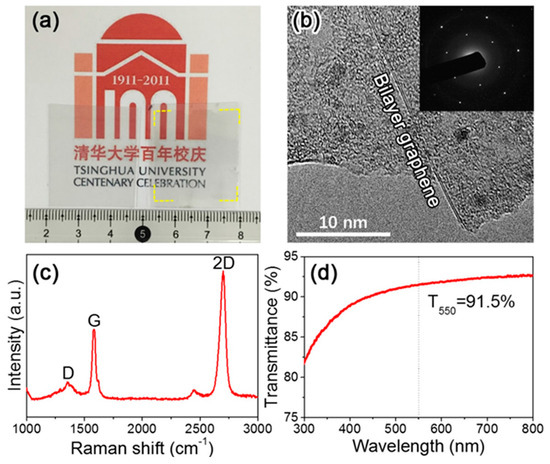 (a) Photograph of a few-layer graphene film transferred onto a polyethylene naphthalate (PEN) substrate; (b) High-resolution transmission electron microscopy (TEM) image of as-synthesized few-layer graphene film. Inset shows the corresponding selected area electron diffraction (SAED) pattern; (c) Raman spectrum and (d) transmittance spectrum of the as-synthesized few-layer graphene film.