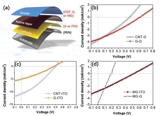 (a) Schematic illustration of flexible solar cell devices with all-carbon electrodes and their indium tin oxide (ITO) analogues; (b) J–V characteristics of solar cells with CNT (or G) as the anode and G as the cathode; (c) J–V characteristics of control devices using ITO as the cathode and CNT (or G) as the anode; (d) J–V characteristics of solar cells with MG as the anode and G (or ITO) as the cathode. Here “G” and “MG” denote few-layer graphene films and multi-layer graphene films, respectively.
