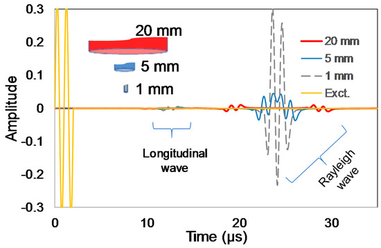 Waveforms received by different size sensors for the case of surface source and excitation frequency of 1 MHz. The excitation wave (yellow starting at time 0) was reduced to the graph axes for clarity (nominal amplitude of 1).