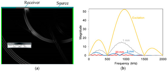 (a) Snapshot of displacement field corresponding to 22 μs after excitation (frequency at 1 MHz). The source is set on the surface; (b) Fast Fourier Transforms (FFT) functions of the waveforms received by different size sensors.