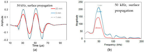 (a) Waveforms received by different size sensors for the case of surface source and excitation frequency of 50 kHz; (b) FFT functions of waveforms received by different size sensors (exc. frequency at 50 kHz and surface source). The corresponding waveforms are depicted in Figure 4a.
