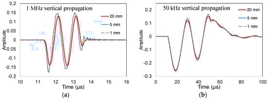 (a) Waveforms received by different size sensors for the case of vertical source and excitation frequency of 1 MHz; (b) Waveforms received by different size sensors for the case of vertical source and excitation frequency of 50 kHz.