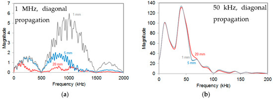 (a) FFT functions of waveforms received by different size sensors (exc. frequency at 1 MHz and diagonal source); (b) FFT functions of waveforms received by different size sensors (exc. frequency at 50 kHz and diagonal source).