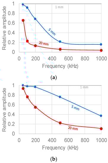 Concerning the last case, where the source is placed vertically beneath the receiver (Figure 8c), relative amplitude is much closer to unity (difference between point sensor and long sensor at 1 MHz excitation frequency is about 15%). These results indicate that the sensor size effect is minimized for propagation vertical to the sensor surface in contrast to other angles of incidence.